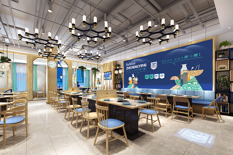 2、整體色調(diào):整體色調(diào)統(tǒng)一在主色調(diào)海藍(lán),天空和大海都是藍(lán)色的,所以藍(lán)色也給人廣闊、沉靜的感覺。同時藍(lán)色也代表著信任與忠誠,藍(lán)色可以激發(fā)消費(fèi)者的忠誠情緒。科學(xué)研究表明:主色調(diào)為藍(lán)色的店鋪比其他藍(lán)色的店鋪吸引的老顧客多約15%,炙成一派烤肉餐廳采用天空藍(lán)的藍(lán)色系,與我們傳達(dá)的新鮮,干凈、現(xiàn)拌的出品特質(zhì)完美契合,使用藍(lán)色刻意營造舒適,純凈的用餐氛圍。