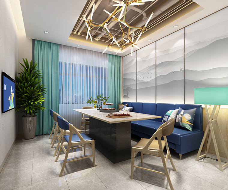 3、家具軟裝:家具是餐飲室內(nèi)環(huán)境的重要部分,因?yàn)檎嫉孛娣e大,并且與顧客的接觸最為密切。所以,家具的造型和色彩對餐廳的整體氛圍起著極其重要的影響。炙成一派的家具選擇了與品牌色接近的天藍(lán)色,椅子的款項(xiàng)選擇新中式的梳背圈椅,舒適度高,且與整體的空間氛圍極為相稱。其他軟裝如花藝,小包枕,窗簾等,體現(xiàn)空間藝術(shù)裝飾性及舒適度之余,還具有趣味性和品牌軟性宣傳。