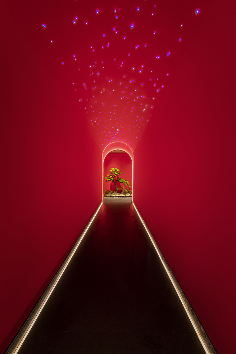 部分立面使用玻璃磚作為隔斷,在燈帶烘托下,產(chǎn)生一種晶瑩剔透感,時(shí)尚又夢(mèng)幻;大廳卡座的隔斷高110CM,圓洞虛實(shí)結(jié)合,畫(huà)在景后,景在畫(huà)中。