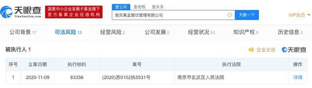 天眼查App顯示,近日,南京黃孟餐飲管理有限公司新增一條被執(zhí)行人信息,執(zhí)行法院為南京市玄武區(qū)人民法院,案號(hào)為(2020)蘇0102執(zhí)5531號(hào),執(zhí)行標(biāo)的83356。據(jù)新京報(bào)報(bào)道,黃磊和孟非共同經(jīng)營的火鍋店“黃粱一孟”所屬公司即為南京黃孟餐飲管理有限公司。目前,該店已經(jīng)閉店。此外,今年9月,南京黃孟餐飲管理有限公司發(fā)生工商變更,黃磊退出投資人。