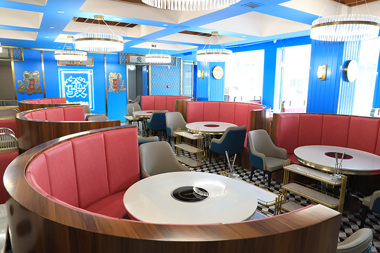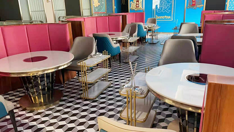 整體氛圍去掉繁雜多余的線條,多用皮質(zhì),不銹鋼材質(zhì),呈現(xiàn)精致,高品質(zhì)的用餐氛圍!空間的整體照明燈光以柔和面光為主,餐桌上方局部聚光燈照明,突出火鍋湯底的特色,金黃明亮;特色的吊燈,讓空間層次鮮明,港風(fēng)濃郁。家具以皮革為主,金屬收邊,加上小屏風(fēng)讓空間感更通透,能表達(dá)出輕奢的質(zhì)感。