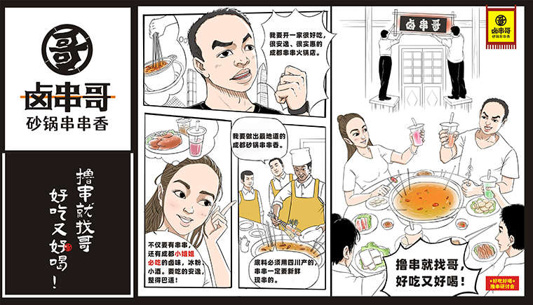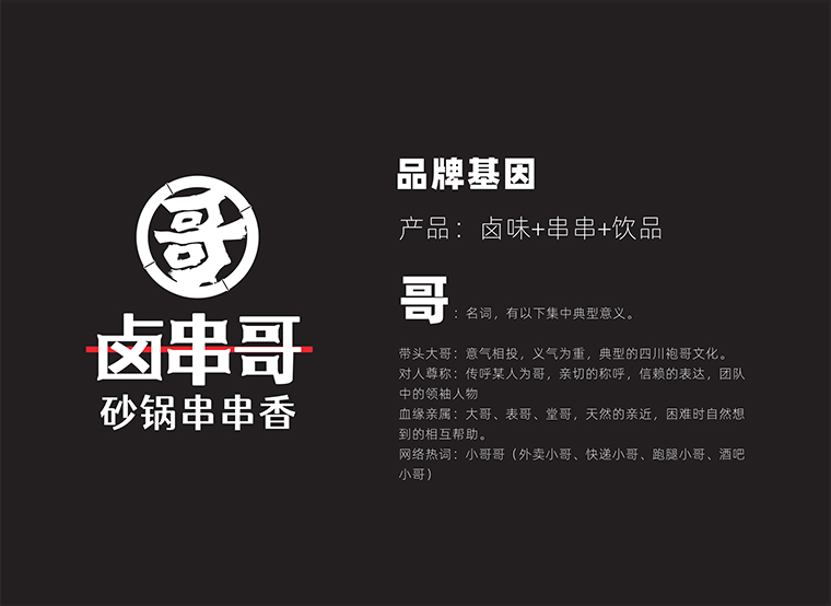 我們從鹵串哥品牌內(nèi)在基因出發(fā),提取升華了哥的文化,哥的符號。哥在四川既是表達(dá)親切信賴,尊重,也是袍哥文化,江湖義氣的表達(dá);同時哥還是負(fù)責(zé),擔(dān)當(dāng)?shù)囊庀螅桓邕€與當(dāng)下外賣小哥、快遞小哥、餐廳服務(wù)小哥的一種親切稱呼。