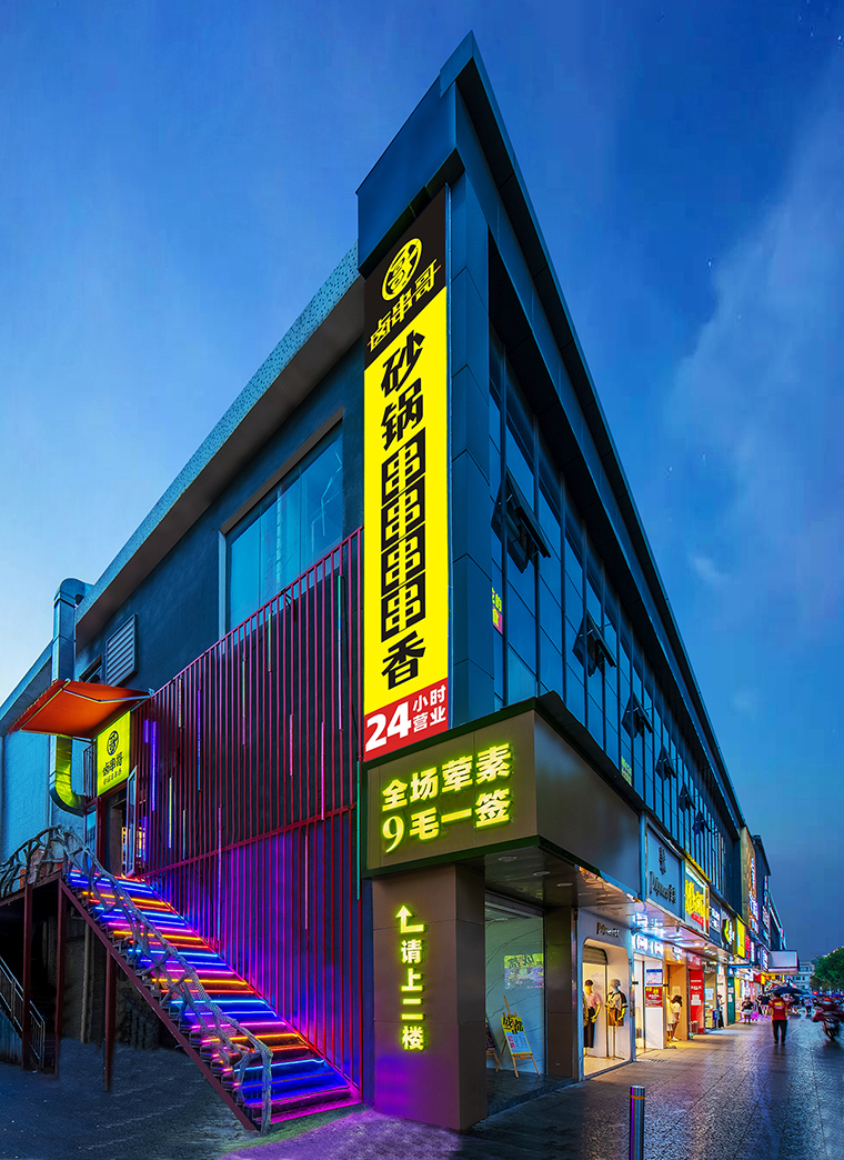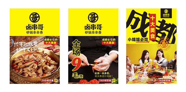1、將門頭設(shè)計(jì)轉(zhuǎn)變成門面設(shè)計(jì),重點(diǎn)投入,反復(fù)推敲,裝修經(jīng)費(fèi)傾斜,用力猛一些。鹵串哥坪山店的整個外立面廣告招牌,設(shè)計(jì)非常大氣,覆蓋一整面墻,讓遠(yuǎn)遠(yuǎn)的顧客都能看見,門面上顧客可看見的地方不斷重復(fù)強(qiáng)調(diào)品牌核心訴求,如24小時營業(yè),地道成都砂鍋串串香,小姐姐必吃成都十大美食,9毛一簽等,讓門面成立吸引消費(fèi)者進(jìn)店的大利器。